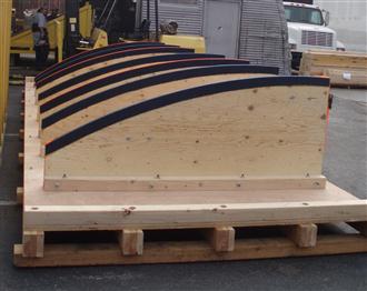 Large “A Frame” specialty pallets can be manufactured to help minimize wide load issues. We also build “H Frame” style custom pallets that will curve to intricate parts. Our heavy duty custom transportation and handling pallets are fabricated with large timbers, bolts and metal braces. We have also built custom bases and pallets that have contours for large airplane skins.