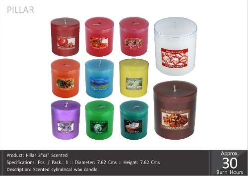 Contact SupplierPillar Candle made of scented wax. Available fragrances Rose, Strawberry, Apple Cinnamon, Lemongrass, Ocean Breeze, Orange, Lavender, Jasmine, Fresh Linen, Peppermint and Sandalwood.