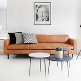 Simple and modern in cognac coloured leather, a classic 3.5 sofa exudes style and sophistication. Dimensions: 220W x 87D x 57H Leather is a natural product therefore every piece of leather is unique. The leather used may have some natural markings such as dents, scars, scratches, wrinkles or blemishes. These natural markings or irregularities should not be considered as a defect. Variations in the texture of the leather should not be considered a fault or a defect either.