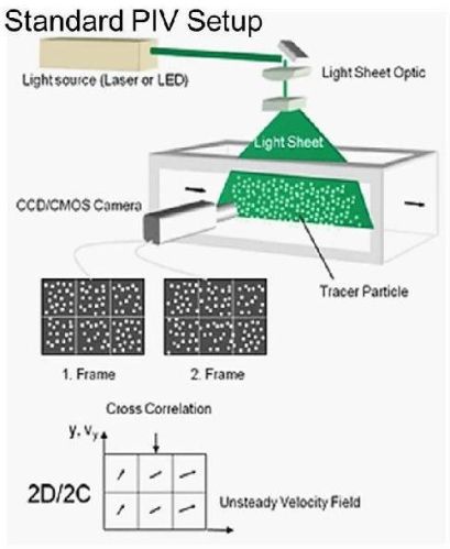 For the purpose of PIV, the fluid is seeded with light scattering particles, which are believed to follow the flow dynamics. The flow is illuminated by a concentrated light source, normally a laser, where as a special camera is acquiring the reflected light from tiny particles in the flow. The camera takes two consecutive images which are synchronized with the two light pulses. The light pulse is very short such that single particles can be identified in the images without blurring effects. The cross correlation software then calculates the displacement of the particles between the first and second image. Since the time between the two light pulses is known, the velocity field can be calculated.