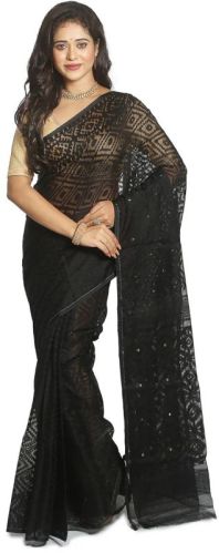 Festiv collections of Partywear Black Self Soft Jamdani Saree. This drape is thoroughly covered with various patterns and motifs using thread and zari work. This makes the saree quite exclusive in nature. It is purely handloom Jamdani Sarees and mostly worn at the time of festivals, marriage party & any special event that needs exclusive attire.