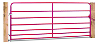 Utility, horse, field and ranch gates of 18 gauge, 1 34" 5 or 7-bar construction with standard Z-bars mitered and welded connections 50" high with 5" radius rounded corners Positive lock system. This gate has one fixed hinge and one adjustable bolt-on hinge to support 58" x 13" hinge bolt Gate to be used with wood posts Designed for open field, horse paddock and pasture use Powder Coated HW Brand Red All gates are 4" shorter than listed length, allowing for hardware and clearance.