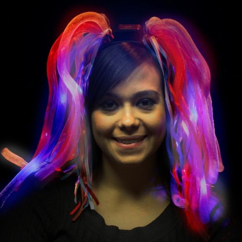 For novelty dreadlocks that will show your national pride, look no further than this patriotic LED light-up costume diva dreads! This eye-catching and illuminating item is made up of high-quality 14" red, white and blue ribbons and dazzling LED lights of the same color inside a 14" net tubing, all built onto a plastic headband. It is one-size-fits-most and comes with three AG13 batteries included and installed, Available unimprinted only. Sold by the piece. Make the most of your USA-themed parties and celebrations!