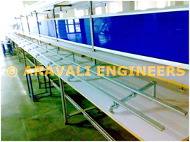 Manual and motorized conveyors for component insertion of PCB. Construction of Extruded aluminium section.  Motorized conveyor with timer or push button based start/stop transfer.  Accessories available illumination, electrical sockets, display board, centre platform, display counter, end stopper, tool hanger, screw channel, bin hanger, air pipeline with QRC, rejection chutes and bin stands  Constructions Extruded Aluminium sections, MS sections, SS sections. Â
