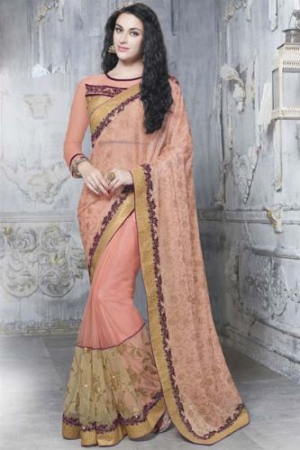 PEACH COLOR LYCRA SHIMMER & NET EMBROIDERED PARTY WEAR SAREE?
