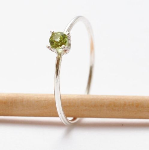 {O F F E R I N G} This listing is for one 1mm wide handmade sterling silver ring with a prong set 3mm natural peridot. Very thin, delicate and dainty! Since this ring is handmade, sometimes there will be small hammer and file marks. {M A T E R I A L S} Sterling Silver. Approximate 3mm natural peridot. {S I Z I N G} This ring is available in sizes 2-12 in whole, half and quarter sizes. {M A D E T O O R D E R} This ring is made to order and current wait time is 1 week.