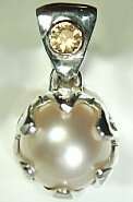 The pearl is a South Sea, a whopping 10.38 ct., light creamy-yellowish (natural color), 11.6mm, round, with excellent texture and glow, from the Celebes Sea, Philippines. There is a 4mm round, unheated, yellow-champagne, Ceylon sapphire placed on the bail. The "crown" pendant is in silver-platinum alloy. Very rare size pearl, with a real, natural, moonlike color, set in the ultimate, cosmic talisman.
