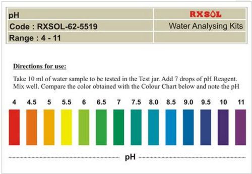We are offering ph test kit. Directions for use :- take 5 ml water sample to be tested in the test jar. Add 4 drops of ph reagent, mix well. Now place this test jar on color card (see back side.) match color in the test jar with different printed colors. (view from topside vertically downwards) note down the ph of the sample after color comparison.