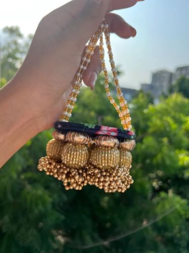 The diya holder is beautified with 7 tassels and 2 pearl chains. It has a key ring for hanging purpose. The diameter of the holder is 3 inches, height from bottom tassels to base is 2.75 inches and the length of the pearl handle is 4 inches. The total height of the holder from the key ring to beads is 8 inches approximately.