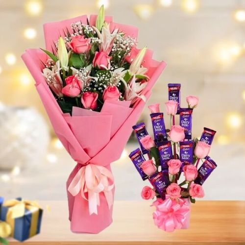 Contact SupplierThe bouquet features pink roses, white lilies, and baby’s breath flowers, all wrapped in pink paper and tied with a pink ribbon and other is a combination of pink roses and Cad-bury Dairy Milk chocolate bars arranged together. Both arrangements are perfect for anniversaries, birthdays, gifting to your loved ones or as a charming centerpiece for special events, adding a touch of elegance and sweetness to any celebration.