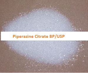 We are offering piperazine citrate. piperazine citrate bp/usp specification: a white crystalline powder assay (on anhydrous basis) 98.0 % to 100.5% water nmt 12.0% 11.15% primary ammines & ammonia ratio (nmt 0.5) application: piperazine citrate is used as an anthelmintic for humans and farm animals against intestinal roundworms and pinworms infection; administered orally. packing 25 kg in fiber drum