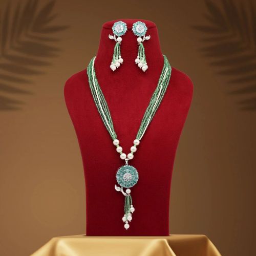 Adjustable Rope | Necklace Length: 50.00 CM x Width: 1.00 CM | Pendant Length: 9.00 CM x Width: 3.50 CM | Earring Length: 8.00 CM x Width: 2.50 CM | Metal: Brass With Good Quality Silver Plated | Color: Pista Green | Stone: American Diamond & Monalisa Stone | Gross Weight: 135.00 Grams | Package Content: 1 Piece Of Necklace:: 1 Pair Of Earring | Back Finding: Post With Friction Back x Earring Style: Drop | Care Instruction : Avoid Heat & Chemicals Like Perfume, Deo, Alcohol, Etc. | Clean With Dry Cotton Cloth | Pack In An Air Tight Container After Use.