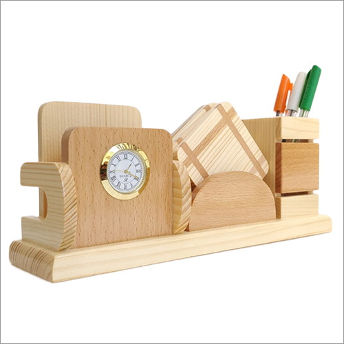 Wooden Pen Stand With Clock Card and Mobile Holder