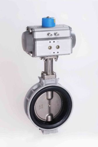 The connection between the flap and the actuator follows a standard interface (flange connection). The rotary movement in the actuator is achieved by a linear piston with a steep-threaded spindle. The rotary actuator moves the butterfly valve by max. 90°. The compact electropneumatically actuated control valve can be used for a wide range of applications and media. NOTE: The use of these control valves is only useful in a process control loop; The valve is not suitable for direct position control.
