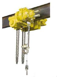 The standard pneumatic hoist package includes vane or piston motors and brakes with modulating valves for infinitely variable hoist motion. Single speed trolley or tractor motion is standard using vane motors and our standard worm gear reducers. Standard controls include a two or four lever pendant. Lowest Headroom Available • Capacities: 1-12 ton to 25 ton • Spark Resistance Models • Corrision Resistant Options