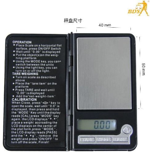 Model name :  BDS-808 Units : g,oz,gn,ct Capacity : 100g/0.01g, 200g/0.01g, 300g/0.1g Scale size: 85*50*12mm , Platform size : 50*40mm Carton size :37.6*29.8*23.7cm Scale color : black Power :  1-CR20 32 battery Packing : color box , 100pcs/carton Features : With high precision pressure sensor Portable clamshell design, stainless steel Platform LCD display with backlight 60 seconds automatic off