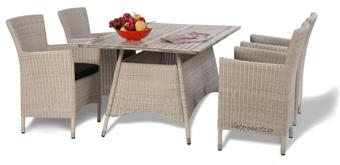 We offer Poly Rattan Table Set. Size - table: 155x90x73 - chair: 58x61x87 part : four comfortable chairs with black cushion and one table constructed in white, round wicker material : - alu frame, powder coating, tube 25mm, thickness 1.1mm - round white wicker 2,8mm - seat cushion: thickness 5 cm, foam d25 - acacia table top, antique look this table set can fit in the dining room, garden or coffee shop. With antique style and elegant color, it's wonderful for you to own the table set like this.