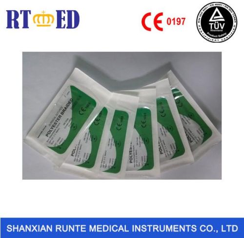 We offer polyester braided suture with needle: non-absorbable ,multifilament,braided suture. Polyester composite of terephthalate with or without cover. Because of its non-absorbable synthetic origin,it has a minimum tissue reactivity. Used in tissue coaption due to its characteristically high tensile strength. Color: green. Frequently used in speciality surgery including cardiovascular and opthtalmic because of its high resistance to repeated bending. Characteristics: synthetic origin. Resistance to repeated flexion. Braided multifilament.