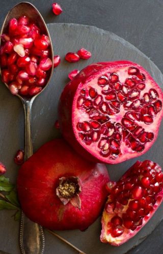 The juicy arils of the fruit are eaten fresh, and the juice is the source of grenadine syrup, used in flavorings and liqueurs. Pomegranate is high in dietary fiber, folic acid, vitamin C, and vitamin K.