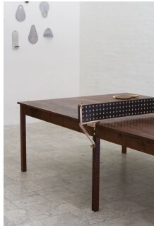 REMOVABLE LEATHER NET WITH CAST-BRONZE ARMS DOUBLES AS A DINING TABLE. INCLUDES 4 PADDLES. FINISH 1 CHERRY NATURAL OIL CLARO WALNUT NATURAL OIL BLEACHED MAPLE NATURAL OIL FINISH 2 NATURAL MULLED LEATHER NET DARK MULLED LEATHER NET DIMENSIONS 108 L X 60 W X 30 H
