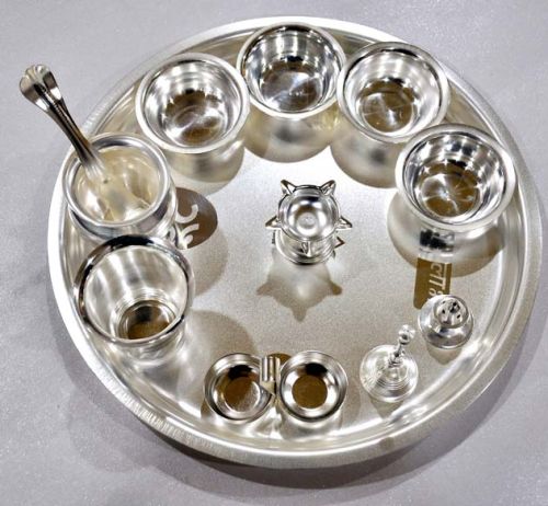 This set of twelve products including thali superbly designed puja thali which is manufactured from qualitative combination of copper-brass metal plated with silver plating. This thali is specially designed for the festivals. It can be used for the puja purpose that makes an impressive impression on the frontier. This is having an incredible look and fantastic finishing.