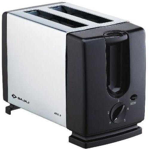 Bajaj ATX 3 Metallic Auto Pop up Toaster Variable browning controlsElectronic auto pop upStainless steel outer bodyIntegrates cool touch handle and sidesMid cycle cancel functionCord winder on the baseSlide out crumb tray Â