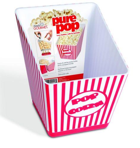 POPCORN BOWL Popcorn bowl “Backboard” keeps hot air popcorn in bowl. Sifter strains excess butter, salt, & unpopped kernels. Full taste of butter & salt without excess calories. Easy to clean & dishwasher safe. Patent pending. ID JB7656 BRAND HGM CASE PACK 24 CASE WEIGHT 23.45 CASE LENGTH 19.20 CASE WIDTH 16.00 CONSUMER PACK COLOR BOX CONSUMER PACK DIMENSIONS 7.35" X 8.75" X 8.75" UPC EAN NUMBER 017874021185