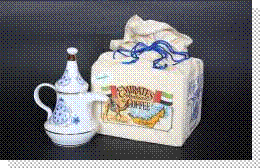 A tea pot in Aladdin style with Moghul character serves 2 small cups. Created in the 4 usual color line design of blue, red, green and black.