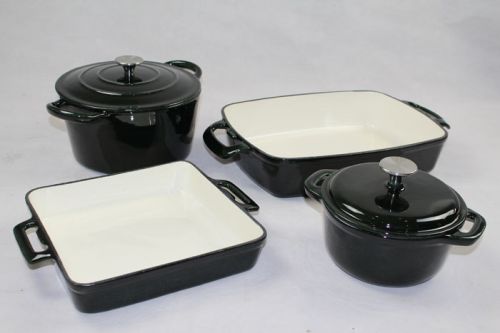 Contact SupplierGoes easily from oven to table for beautiful presentation! Flat bottoms are enameled as the exterior. EF cookware 6 Piece enamel Cookware Set iscolorful and stylish cookware set elegantly present the warmth and care thatgoes into preparing a meal. The 6 Piece Cookware Set is evenly conduct andretain heat while withstanding the rigors of daily use. Porcelain enamelinterior finish requires no seasoning and resists scratches and chips. Other colors are available. Item No.: EC4005 Material: Cast Iron Finish: Enamel Packing: Carton Heat Source: Gas, Oven,Ceramic, Electric, Induction, No-Microwave Composed By EC1014A 23*18*9cm EC1045Â 45.5*27*8cm EC1054Â 32*23*12cm EC1063Â 31.5*25*5cm