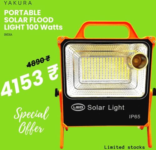 Yakura Solar - Portable Solar Flood Light 100Watts Model No. - 100W LED - 100W, 360pcs LED Solar panel - 4V, 10W Battery - 3.2V 12000mAh LifePO4 Solar Charging time - 6-8 hours by good sunshine Lighting mode - Remote Control + Light Sensor + Radar Sensor + Timer Control Lighting time - Over 3 rainy days Material - ABS Work temperature - -30 C to 60 C Waterproof - IP65 Warranty - 2 years warranty Life time ( LED ) - 50,000 hours lifetime