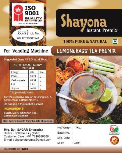100% pure and naturalrnfor the exclusive use of catering ind. And commercial establishment. ingredients: sugar, dairy whitener, tea, lemongrass / masala