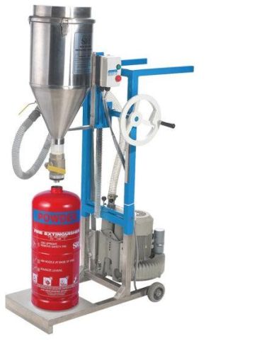 Emptying and filling continuously Window at powder inlet for control of filling Adjustable height for 1kg to 12kg powder cylinder size Hopper material : Stainless steel Filter and hopper can be clean automatically Rubber wheel and Transportation handles Filling speed (approximately): 9kg – 90secs, 6kg – 65secs Suction speed: 18kgmin Optional filling head for mobile fire extinguisher 25kg, 50kg & 70kg Powder suction hose Ø 32 1.5m Suction pipe Ø20 800m