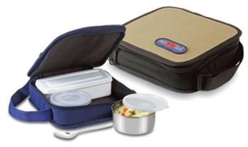 2 small stainless steel lunch containers with air tight plastic lids, Enclosed in soft Insulated pouch Keeps food warm, 1 long plastic container ideal for carrying rolled up roti, Made of food grade material.
