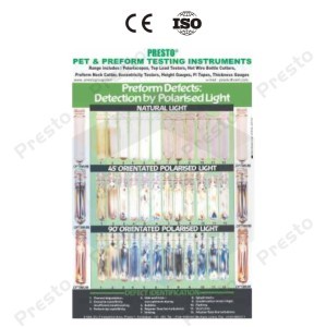 Preform Defect Chart is a consistent tool useful for visual assessment and evaluation of defects found in PET preforms. Used in various industries and laboratories to maintain quality and consistency of a sample to detect the defects under natural and polarized lights.