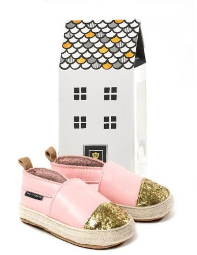 Pretty Brave Espadrille Pink with glitter toe Gorgeous Leather Baby Shoes by pretty brave. Beautiful packaging as displayed. Espadrille style in pink with golden glitter toe