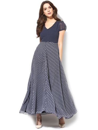 Navy blue and white printed Anarkali kurta, has a V-neck, short sleeves, flared hem Poly georgette Machine-wash Tax: Applicable tax on the basis of exact location & discount will be charged at the time of checkout 100% Original Products Free Delivery on order above Rs. 1199 Cash on delivery might be available Easy 30 days returns & exchange Try & Buy might be available