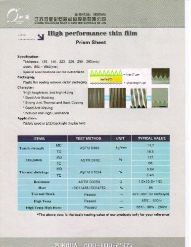 Prism sheet pet film for lcd backlight displayspecification:thickness:135 140 223 228 285 290(mic)width:550~1560mmspecial specifications can be customizedpackaging:plastic film sealing vacuum, carton packagingcharacter:high toughness, and high hidinggood anti-blockingstrong anti-thermal and back coatinggood anti-wavingwet-out and high luminanceapplication:widely used in lcd note book(pc).monitor(mnt).tv backlight display field we have 20 production lines we are the biggest pet film manufacture,we have 20 production lines,our annual production capacity is over 450,000 tons.