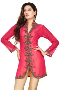 Description No matter what special family occasion falls upcoming on the calendar, this Pristine Beauty Pink Fine Georgette Short Tunic with Heavy Gold Bead Work is a Snehal Creations masterpiece. The tunic has a ban collar and forges a centre open style. Heavy bead work in antique gold adorns the centre, collar and full sleeve edges. Work this with a gold pair of salwaars and your party wear dressing is sorted.