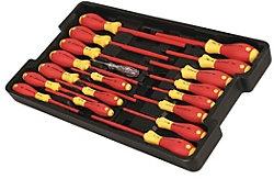 Screwdriver Set, Insulated, Number of Pieces 19, Shank Shape Round, Blade Length (In.) 3 to 8, Overall Length (In.) 7-18 to 12-12, SoftFinish(R) Insulated Handle, Black Finish, CVM Tool Steel, MeetsExceeds ASTM F-1505-01, New VDE Specification 0682part 201 and ENIEC 60900, NFPA70E and CSA, Includes Slotted: 2.5, 3, 3.5, 4, 4.5, 5.5, 6, 6.5, 8, 10mm, Phillips: #0, 1, 2, 3, Square: #1, 2, Xeno Terminal: #1, 2, Single Pole Voltage Detector, Light Weight Tool Box Tray (20 x 11.4 x 2.25 In.)
