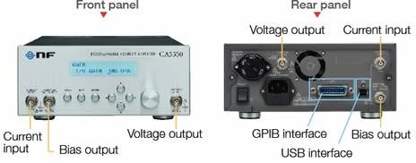 Contact SupplierThe CA5350 programmable current amplifier is a variable gain type, current-input, voltage-output amplifier. Gain can be set from 104 VA to a maximum of 1011 VA. In addition, the included current suppression function enables the canceling of the dark current that cannot be avoided with photoelectric conversion elements such as photo-diodes. BNC connectors are used for input and output, so special cables or an external power supply are not required. The various settings, including gain, are easy to perform using the dial and keys on the front panel, and the set values are displayed on the screen. Since the GPIB and USB interfaces make remote control also possible, gain and other settings can be performed from a personal computer, making it easy to configure an automatic measurement system. With its performance, functions and operational ability, this programmable current amplifier supports the current amplification of signals from a variety of current output sensors.