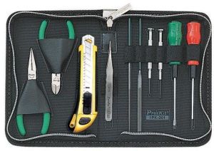 description: proskit 1pk-301,10pcs compact tool kitfeatures:· bag size: 205x144x35(mm) individual packing: inner box & color label shrink specification: 1pk-036slong nose plier 135mm 1pk-037sdiagonal cutting plier 110mm 1pk-125tfine tip straight tweezer 89401a pro-soft s/d 3.2x75mm 89401b pro-soft s/d #0x75mm 908-395e-3 presicion screwdriver 2.4mm 908-395e-5 presicion screwdriver #0 9k003a-1needle file flat 9k003b-1needle file round dk-2039utility knife (3 blades self loading) 908-801acarrying zipper bag