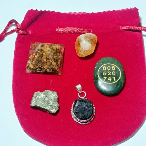 natural stone prosperity kit. in this kit u have 1 tiger eye orgonite pyramid, 1 citrine tumble , 1 green zibu coin, 1 black tourmaline pandent , pyrite rought.