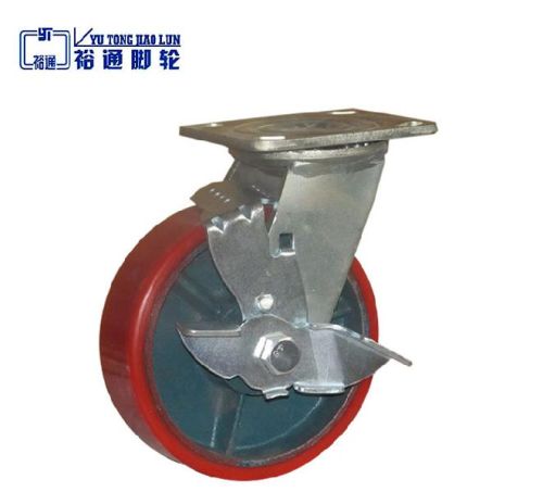 Contact SupplierPU Cast Iron Core Caster With Brake Industrial Pu with rubber series: bracket thickness:5.75mm Polished galvanized surface treatment Lasting light more Antirust Riveting technology high loading capacity Wide useful environment name material wheel dia (mm) wheel width (mm) loading height (mm) loading capacity (kg) bearing offset plate size plate thickness holader thickness medium duty and heavy duty series PU with iron core 100 4550 135 260 double 203bearing 29 hole dia:70*85 plate:100*115 plate thickness:5.75 plate size:5.75 125 4550 160 300 double 203bearing 35 150 4550 190 350 double 203bearing 40 200 4550 235 380 double 203bearing 50.