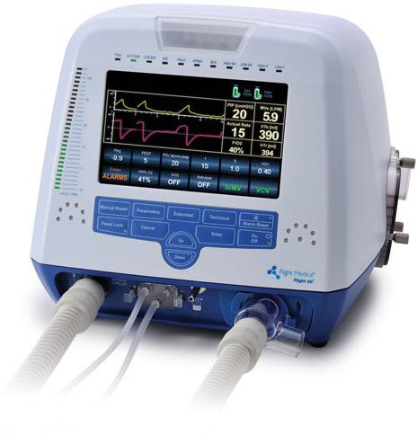 Remarkable performance and features in a portable and intuitive package. The flight 60 ventilators is designed to address a wide range of hospital needs while improving patients comfort and Independence. Safe, Intuitive and Mobile Extensive alarm system Exhaled volume monitoring - meeting critical care requirements Oxygen Sensor - Built in 7" touch screen clearly visible from a distance Lightweight and Portable High pressure and low flow O2 ports Fully independent internal compressor Easily connecting to hospitals' IT Systems
