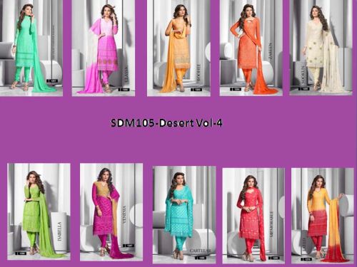 Catalog Name :SDM105-Desert Vol-4 Design :10 MOQ : Full Catalog Rate : 999 INRDesign Full Catalog Rate : 9,990 INR Weight: 10 KG Fabric Details: Top : Pure Chiffon Bottom : Santoon Inner: Santoon Dupatta : Nazneen