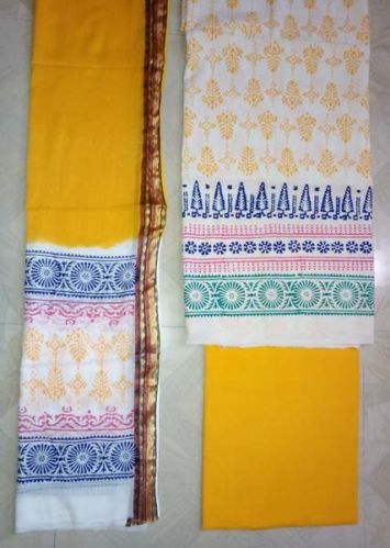 We are offering pure cotton hand block print dress materials. On pure cotton hand block print dress materials with resham border dupatta this is design for top: 2.5 mtrs., bottom 2.5 mtrs and dupatta 2.5 mtrs for good quality of stiching. Fast colors and many designs and every designs have 6 colors of color combinations.