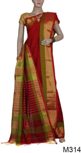 Made of silk and cotton, Maroon colour saree with wide Golden & Green border on pallu with zari work - look even more beautiful. Pure Handloom Maheshwari Saree - It is also known for one of India’s finest fabric, and handloom weaving – The Maheshwari Sari. The graceful & sophisticated design is inspired by the local architecture and striped pallu. Once an exclusive privilege of the royalty has become an established choice of the woman. Free unstitch Blouse piece of this saree.