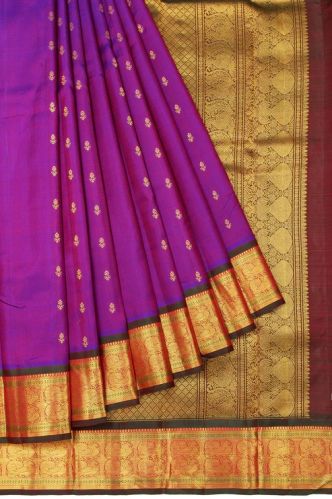 Contact SupplierThe Purple Kanchipuram Silk Saree, bordered with Green and Gold Zari, reflects the luxurious charm of an Indian royal garden in full bloom. The Green pallu, adorned with intricate Mayil Motifs and Diamond Check, channels the grandeur of a palatial feast, while the Green blouse with a plain border enhances this regal ensemble with classic sophistication.