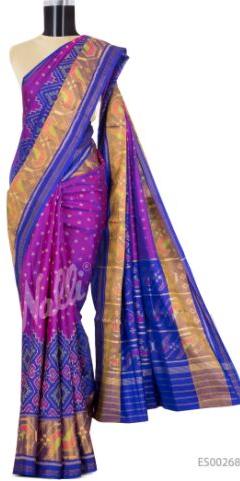 Purple Rajkot Patola Silk Saree with Ikat design on body and Zari border. Includes Unstitched Blouse. Border: Zari Border, Border Type: Contrast.