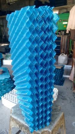 Contact SupplierPvc Fills Manufacturers For Chennai Tamilnadu Andhra Pradesh Telangana Karnataka Kerala Puducherry Goa manufacturing pvc fills for induced draft , counter flow and forced draft cross flow cooling towers in black and blue color as requested by the customers. sizes availbale 600 x 300 x 12mm , 600 x 150 x 12 mm , 1200 x 300 x 12 mm , 1200 x 300 x 19 mm , 1500 x 300 x 19 mm having both side edge folded in virgin quality pvc continuously vacuum formed corrugated sheets through calendar machines . and glued pasted with roller pasting machine for uniform pasting of the sheets without excess glue bonding and burning . these fills are suitable for any make any model cooling tower and scrubbers